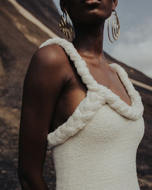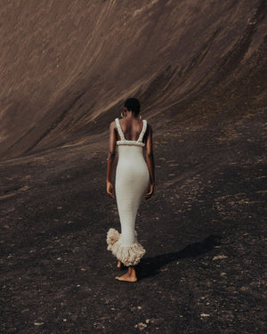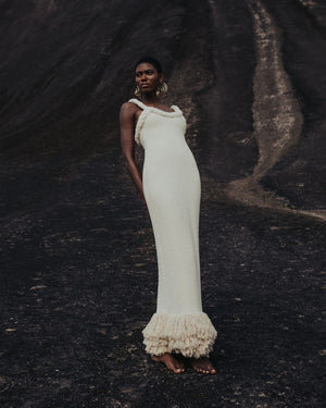 The Suku Dress blends tradition and modern elegance. It features a braided neckline that flows into short sleeves, set over a long, fitted silhouette. Adorned with a wool fringe that evokes the texture of traditional braid styles, this dress pays homage to Yoruba heritage while offering a striking contemporary shape.