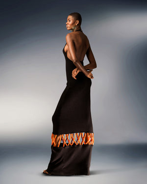 Discover the perfect fit with our stunning halter neck dress called Efe. Meticulously designed for those who appreciate both style and comfort. Crafted from mid-weight knit fabric, this dress features a flattering V-neckline and exquisite beaded detailing at the bottom. The beaded detailing is inspired by traditional Edo beads from Benin, adding a touch of cultural richness and glamour. Ideal for various occasions, it ensures a flawless silhouette.