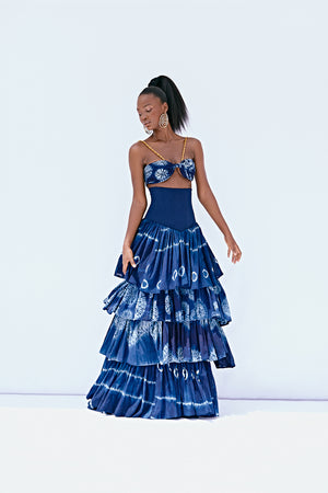 Indulge in the artisanal beauty of our Iwole skirt, meticulously crafted using the shibori dyeing technique. Each layer of fabric is carefully hand-threaded and dyed, reflecting 14 hours of artisanal dedication. Elevate your style with this captivating skirt, designed to flatter your figure and make a statement.