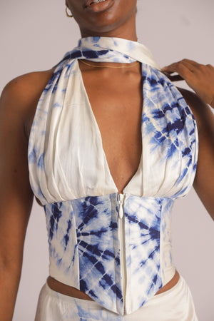 Step into sophistication with our Kosi Top, a true embodiment of elegance and artistry. This exquisite piece features our iconic corset-style top, adorned with a long tie that can be gracefully styled around the neck or in multiple ways, adding versatility to your wardrobe. Crafted with meticulous attention to detail by our artisans, the Kosi Top is made from silk in intricate tie-dye placements known as adire.