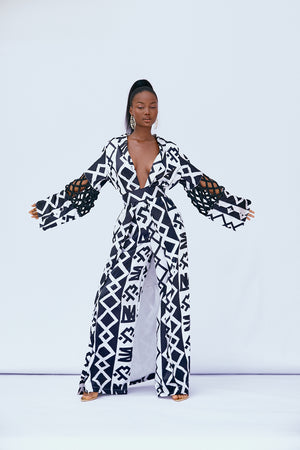 Transport yourself to the enchanting Tiebelè Village in Burkina Faso with our printed silk trousers, inspired by the intricate patterns adorning the village houses. In Tiebelè, women meticulously decorate the exteriors of their homes with geometric motifs, coated with a protective coating made from boiled pods of the African locust bean tree.