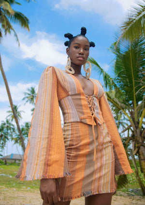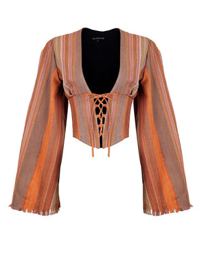 Indulge in artisanal elegance with the YEPA Top, meticulously handcrafted by female weavers named Dan Fani, honoring tradition while empowering women artisans. With its vibrant multicolored threads and intricate fringe detailing, this laced corset top exudes sophistication and charm, perfectly complementing the Yepa Skirt for a coordinated ensemble. Experience the timeless beauty and craftsmanship of the YEPA Top, a versatile piece that effortlessly combines tradition with contemporary style, making it a standout addition to your wardrobe.