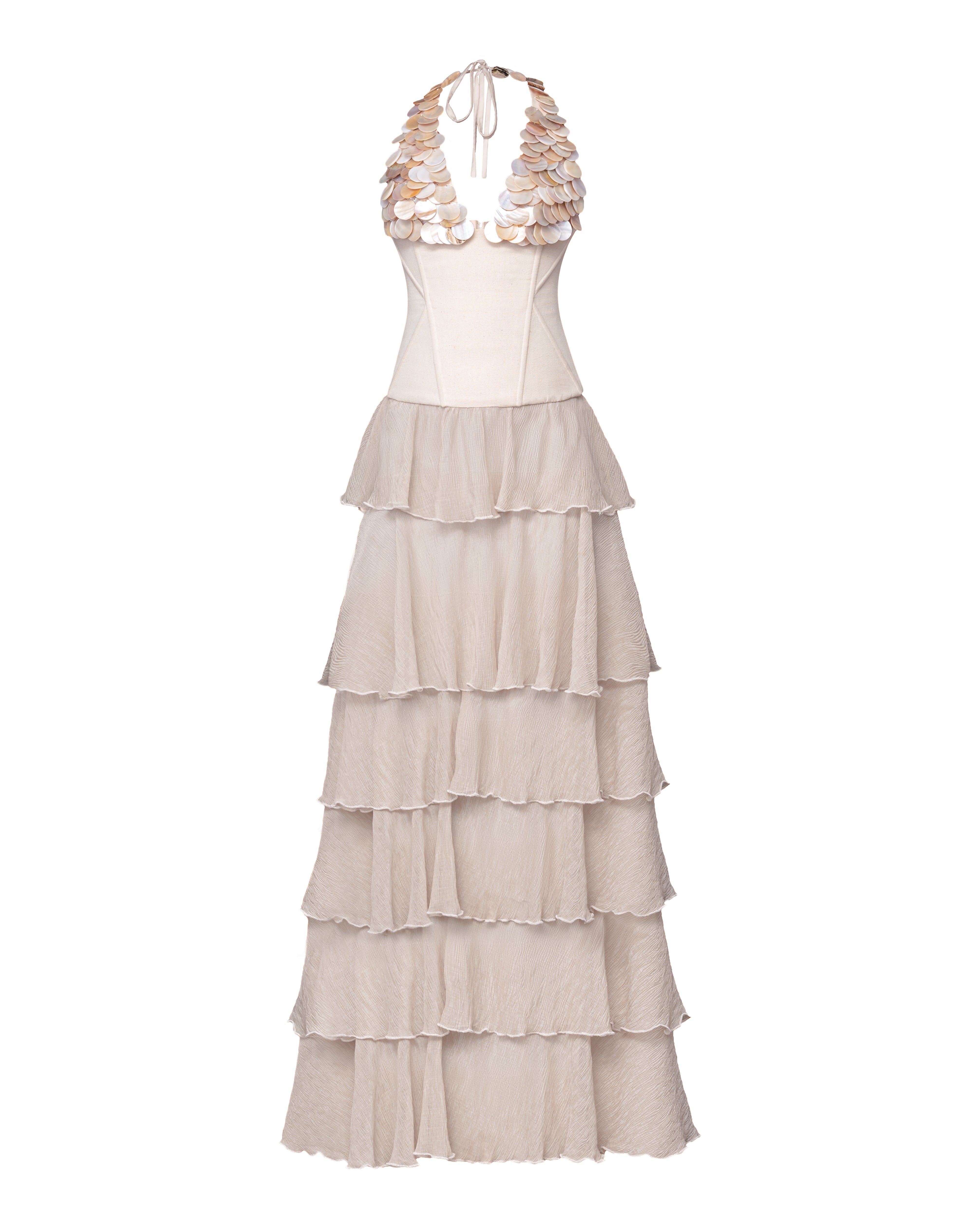 A dress that evokes the serene rhythm of the ocean and the elegance of divine femininity. This ethereal gown features a sculpted halter bodice adorned with over 500 hand stitched shell embellishments, cascading into soft, layered ruffles that flow with every step.