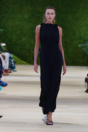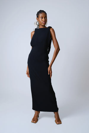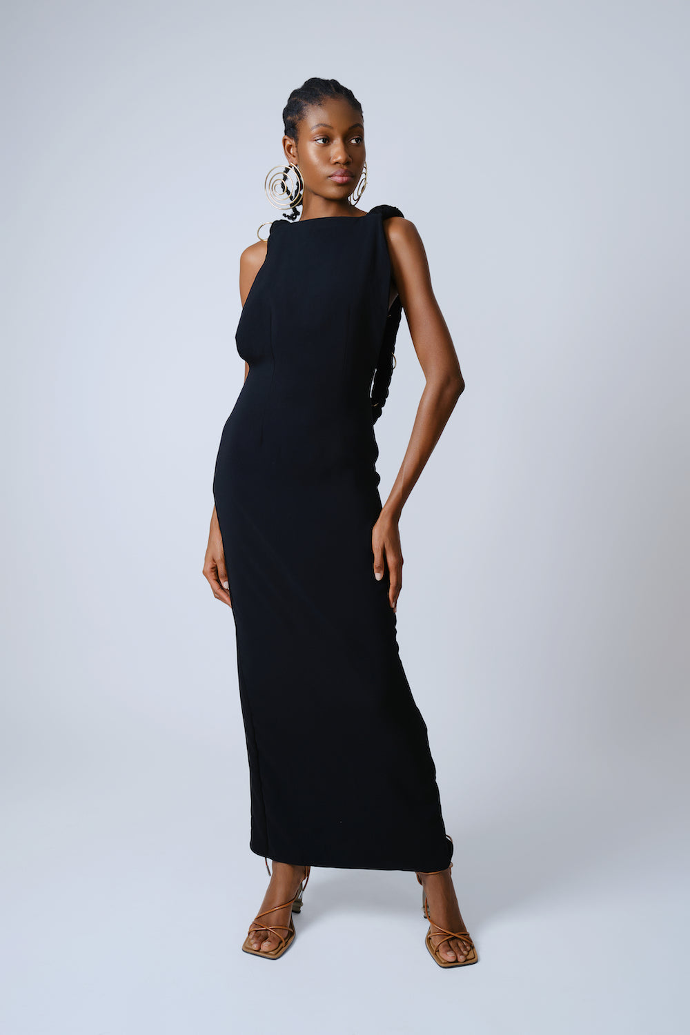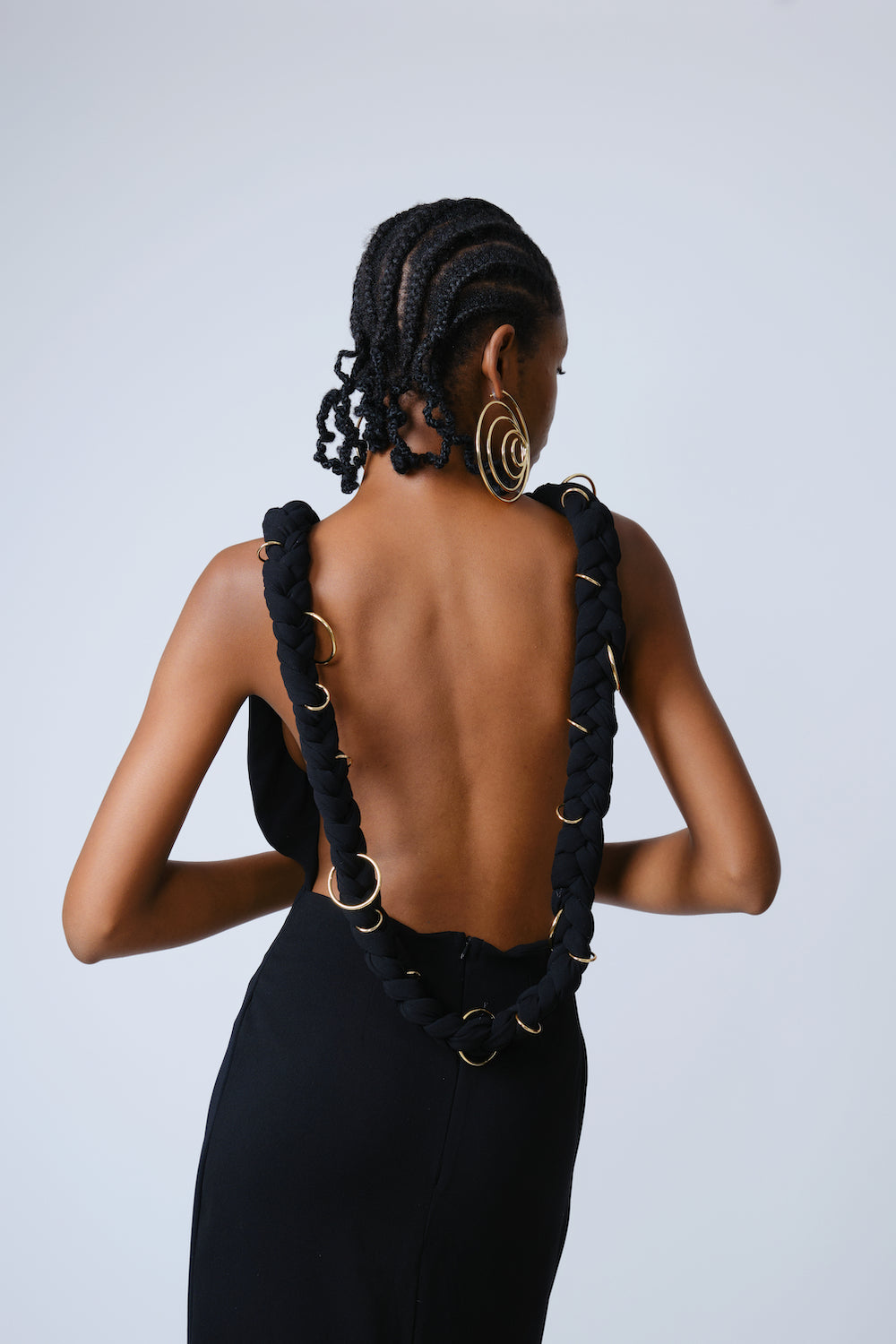 Elegant and daring, the Aladun Dress is crafted to enhance your silhouette with its sleek floor-length cut. Rendered in luxe black crepe, this backless evening gown features a bold braided strap accented with gold hoops, making it a minimalist statement with striking detail.