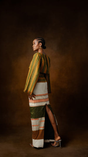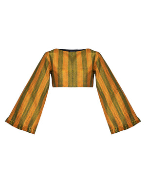 The Awo Top is made from handwoven Faso Dan Fani in a rich green tone with subtle silk-thread. Cut in a cropped shape with wide bell sleeves and frayed hems. Pair it with the coordinating Awo Maxi Skirt for full impact, or style separately with tailored trousers or denim.
