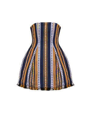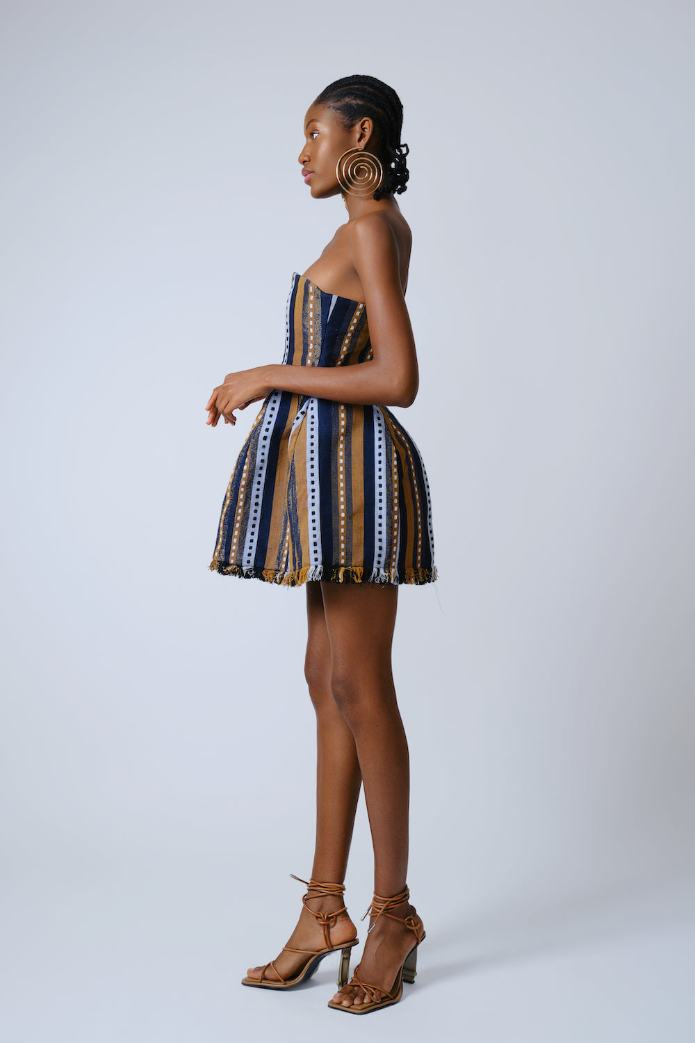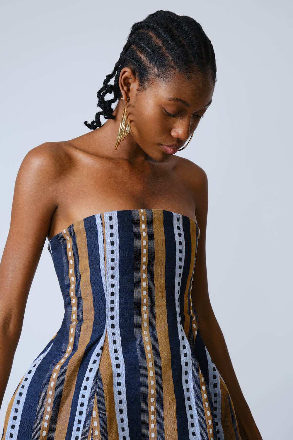 The Ise Mini Dress embodies modern luxury with architectural elegance. Made from Kilentar’s signature striped woven cotton, this strapless mini dress features a fitted waist that transitions into a softly flared skirt, finished with playful frayed hemlines. A hidden back zipper keeps the silhouette sleek.