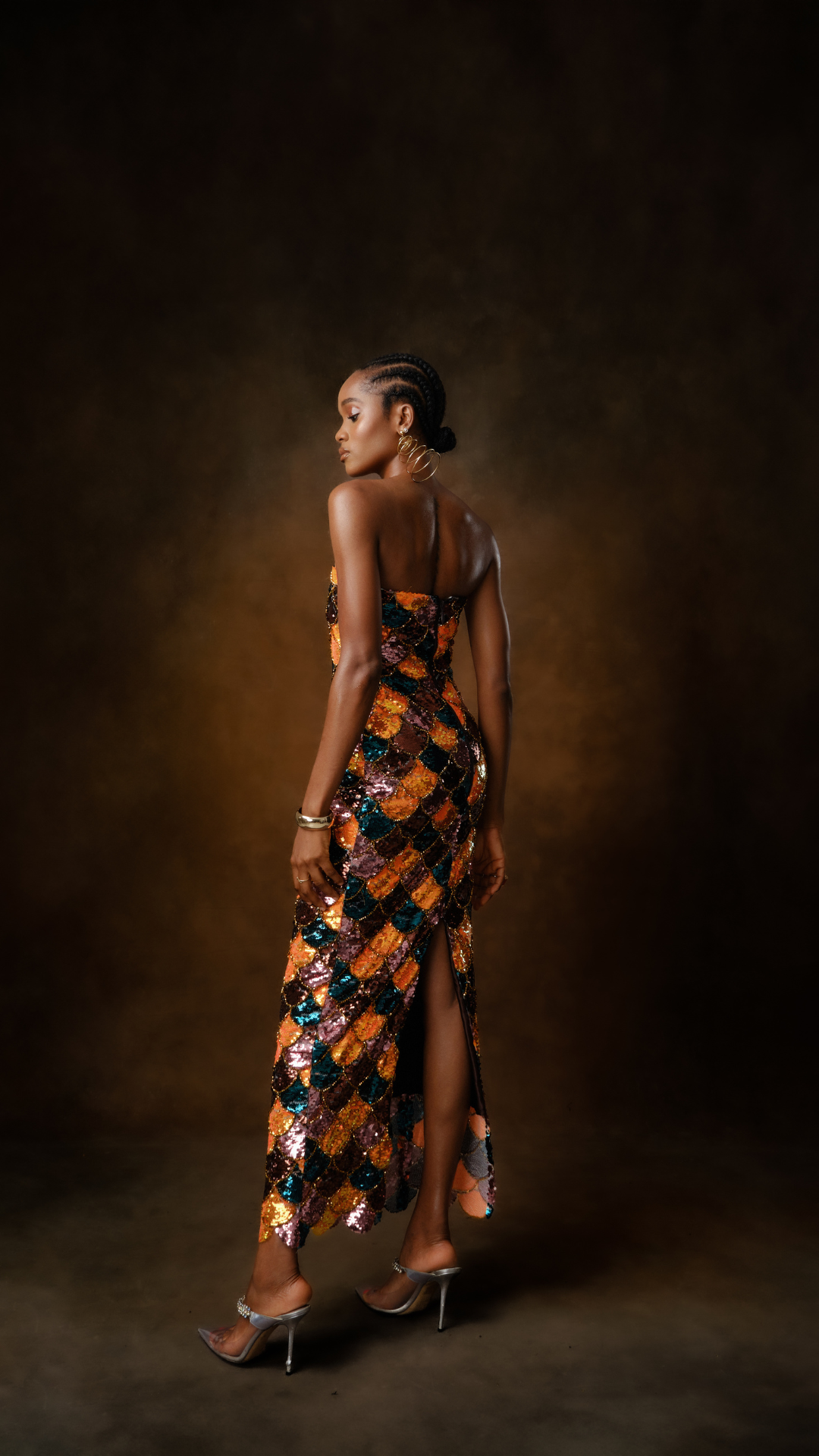 The Isura dress is a strapless sequin dress with a fish scale like pattern in vibrant colors. The dress is embellished with hand-beaded gold beads, creating a shimmering effect that adds a touch of glamour.
