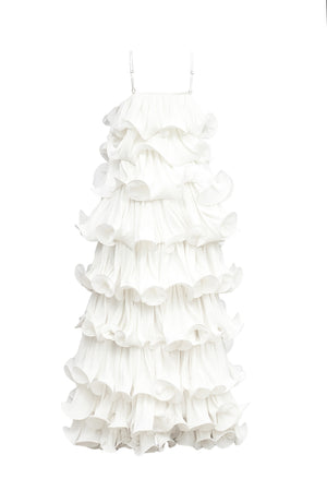 - Ruffled Design: Delight in the intricate ruffled design that adorns the tip of each layer of this stunning dress, adding a touch of whimsical charm and femininity.