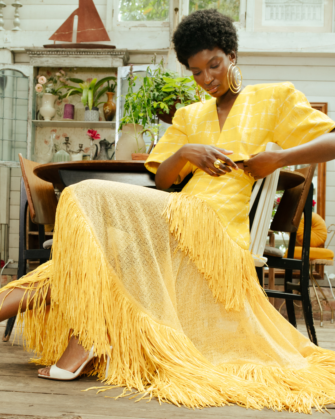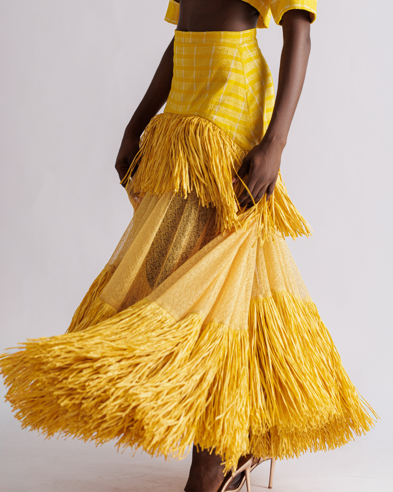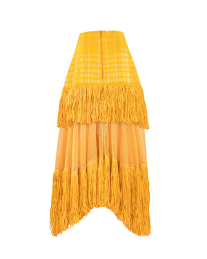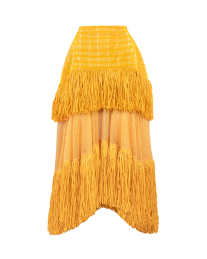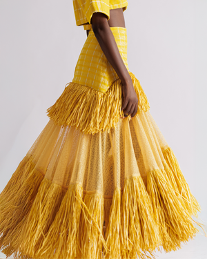 The Ano Skirt is a celebration of bold craftsmanship and movement. The skirt silhouette is layered with semi-sheer mesh and finished with cascading raffia trim for texture and drama. An asymmetric hemline enhances the fluidity of the design, creating a statement with every step.