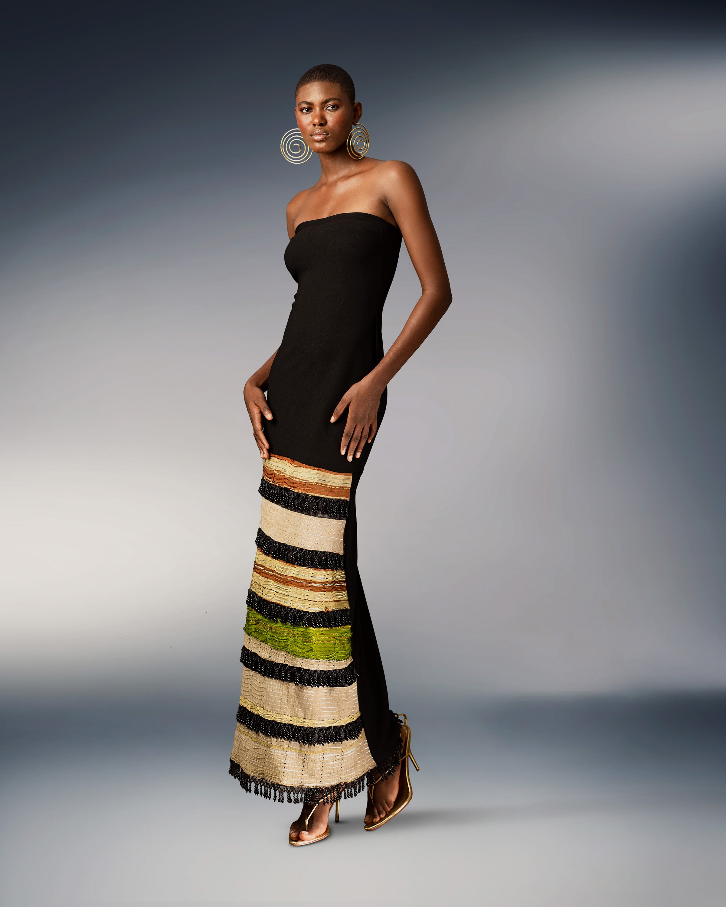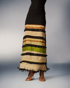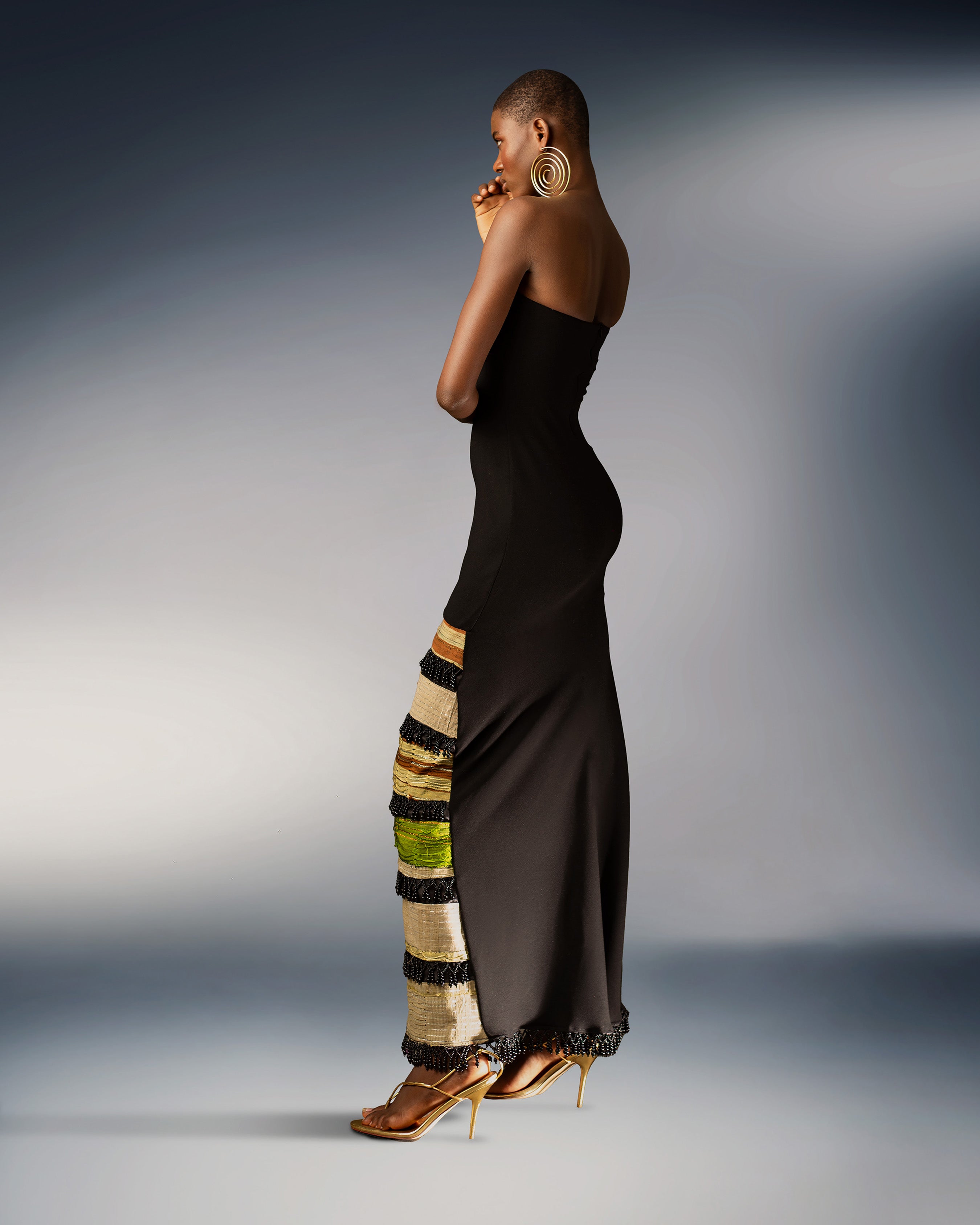 Experience timeless elegance with our Arewa Dress, a sophisticated masterpiece meticulously crafted from exquisite black crepe adorned with vintage aso oke fabric sourced from the 1940s to the 2000s. This festive attire exudes charm with its fringe beaded trims, evoking a captivating sense of movement and style.