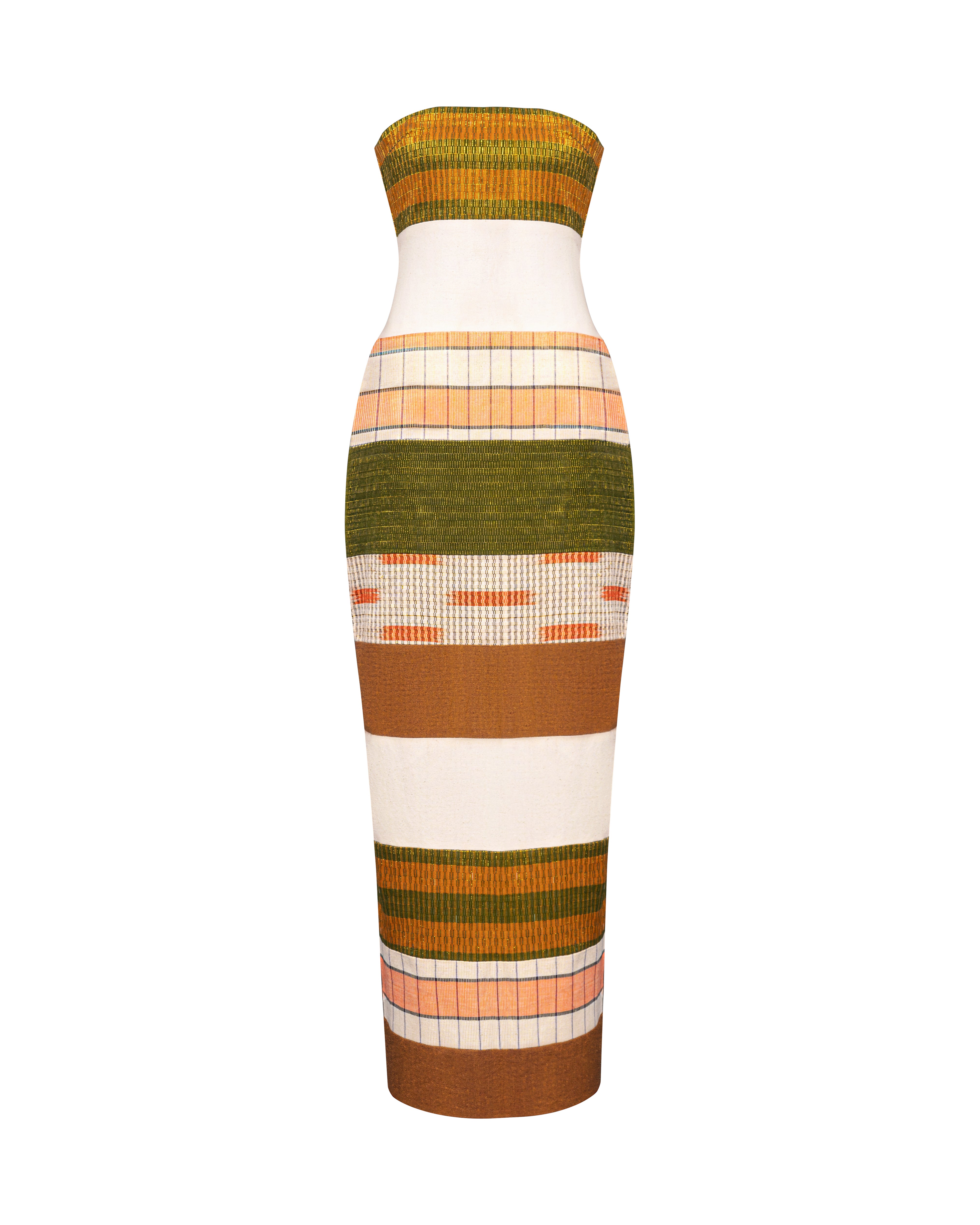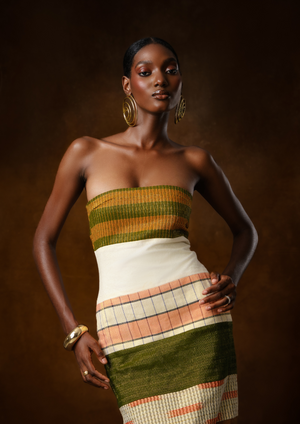 The Awo Dress is a tribute to artistry, tradition and bold colour. Handwoven Faso Dan Fani, dyed with natural hues and silk threads, are patchworked into a vibrant maxi silhouette. Fitted at the bust and waist with corset boning, it flatters the form while a concealed back zip ensures a sleek finish.