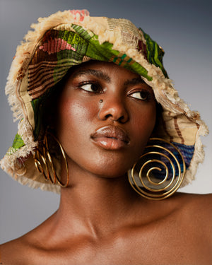 Made with ceremonial 1920s vintage aso oke sourced from Ogun state, the Tola hat has been reimagined and repurposed to create a bucket hat from leftover fabrics of this collection.