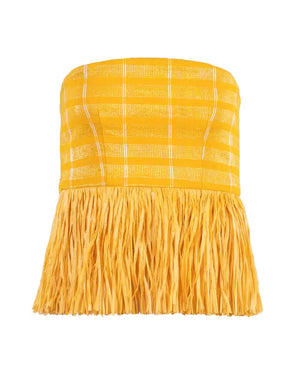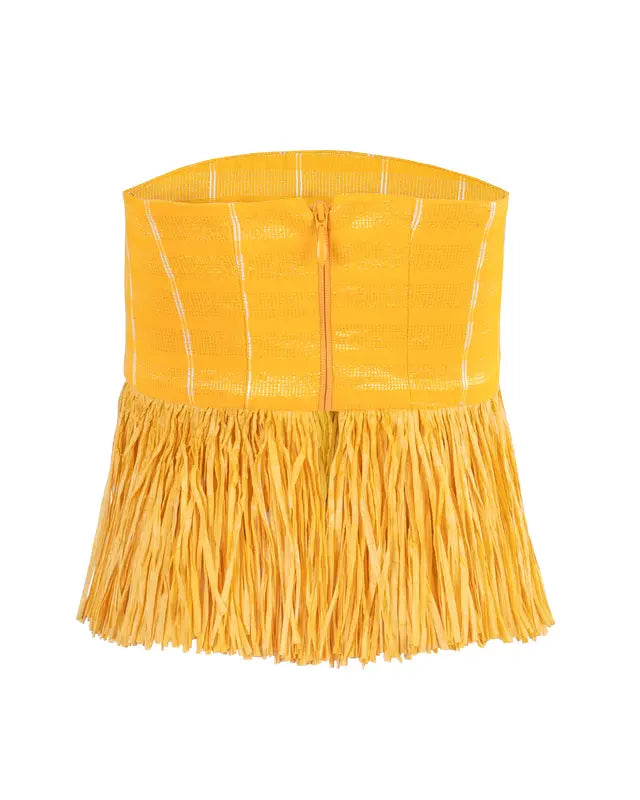 The Ano Peplum Top is a celebration of bold craftsmanship and modern elegance. With its striking raffia hem and clean tailored lines, this sleeveless piece is designed to make a statement.