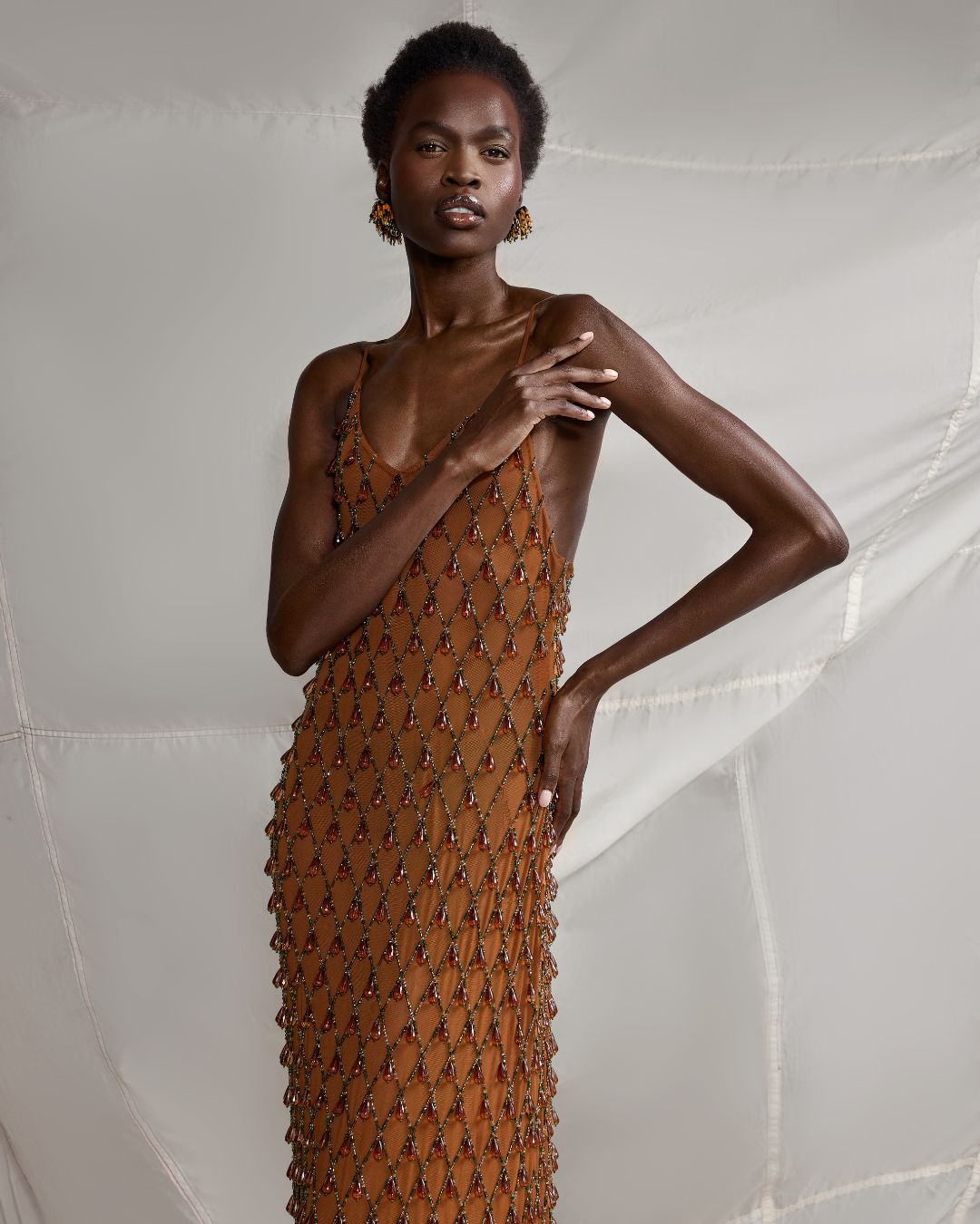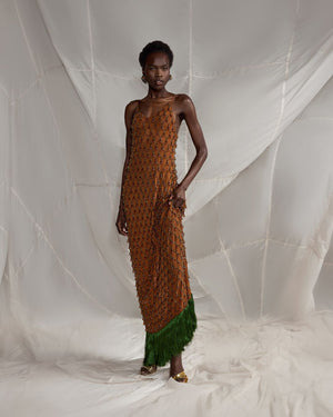 A shimmering masterpiece that blurs the line between couture and jewelry, The dress is defined by hand-stitched lattice of glass beads, each meticulously placed to create an amber-toned glow. The bodice transitions into a dramatic hem of voluminous, floor-grazing green tassels that catch the light and create a liquid-like motion with every stride.