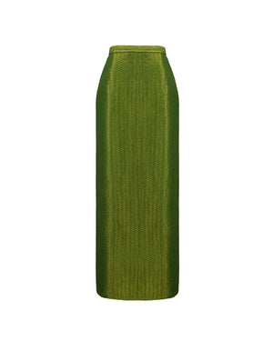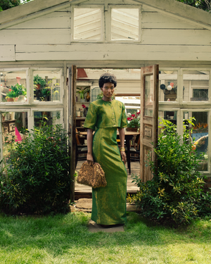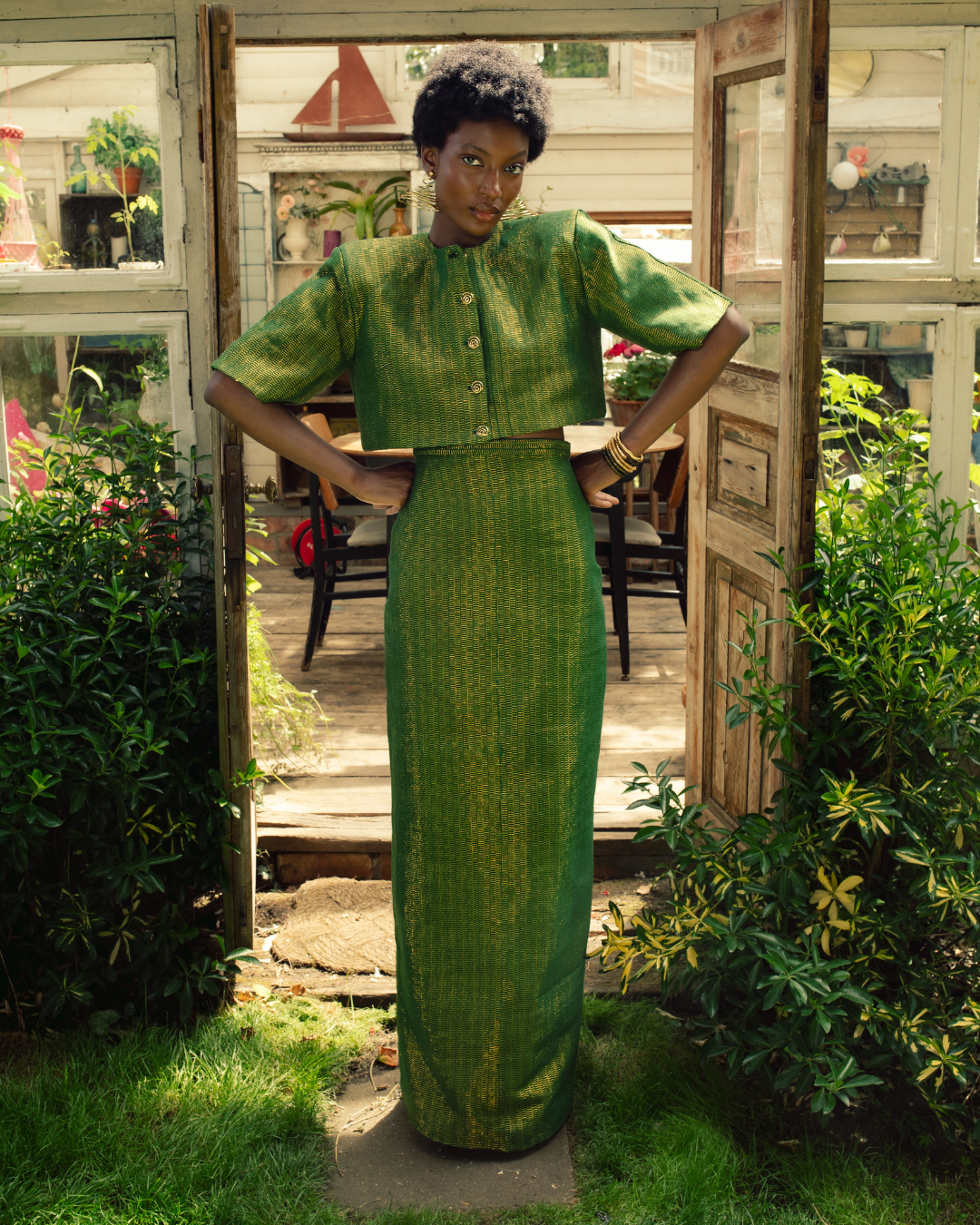 Woven by hand in Burkina Faso from organic cotton blended with silk threads, the Green Oyin Maxi Skirt brings understated luminosity and refined structure to any ensemble. Designed for free movement, it sits high on the waist and flows gracefully to a maxi length, offering both elegance and ease.