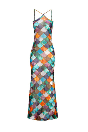 Inspired by the legendary Mami Watta figure, the Mami Dress captures the ethereal essence of the supernatural world. This dress evokes a sense of wonder and magic. Reminiscent of the popular children’s book, Rainbow Fish, the Mami Dress is crafted from lightweight chiffon fabric and adorned with gold beaded detailing, featuring a captivating print that brings to life the mysterious aura of the deep waters.