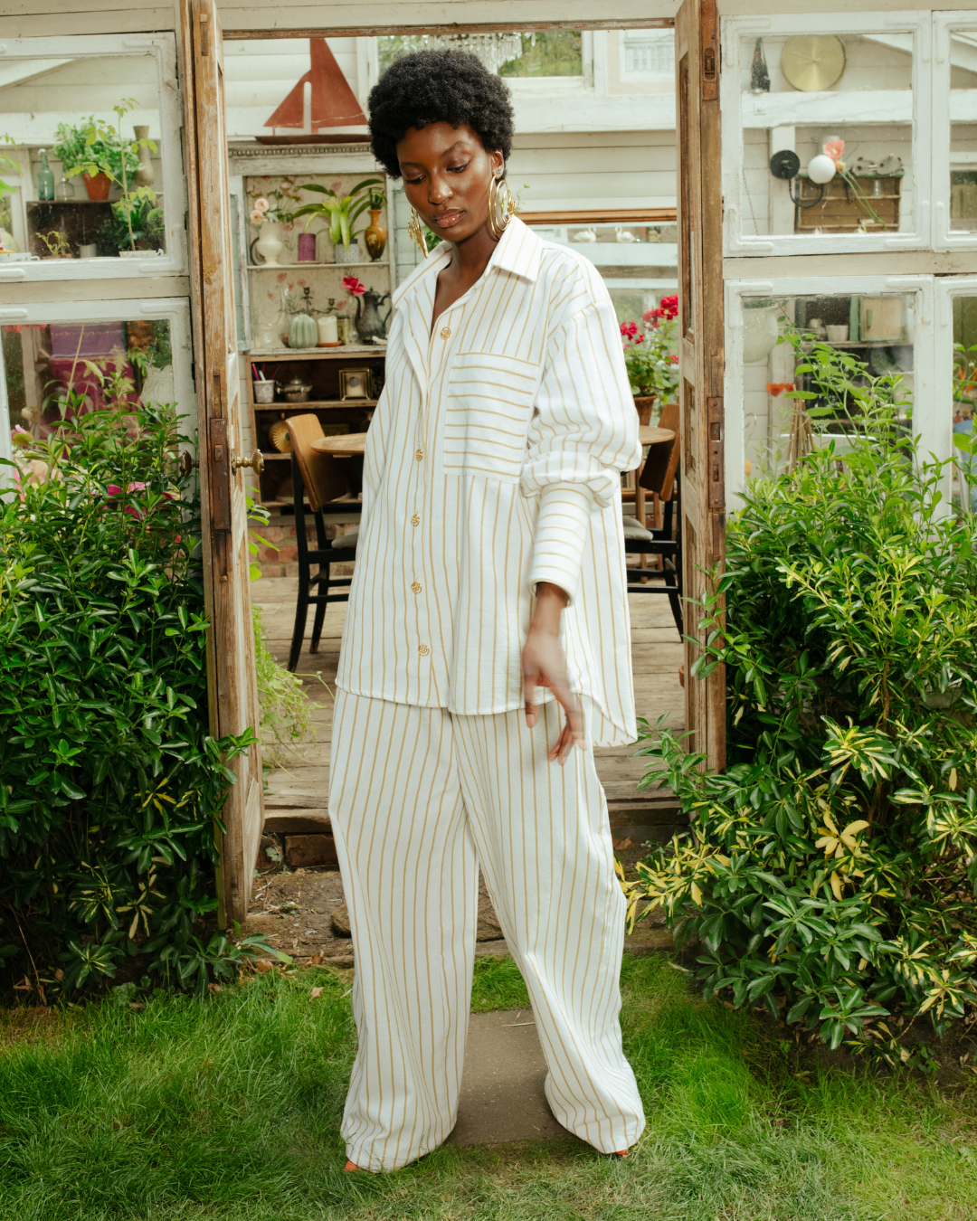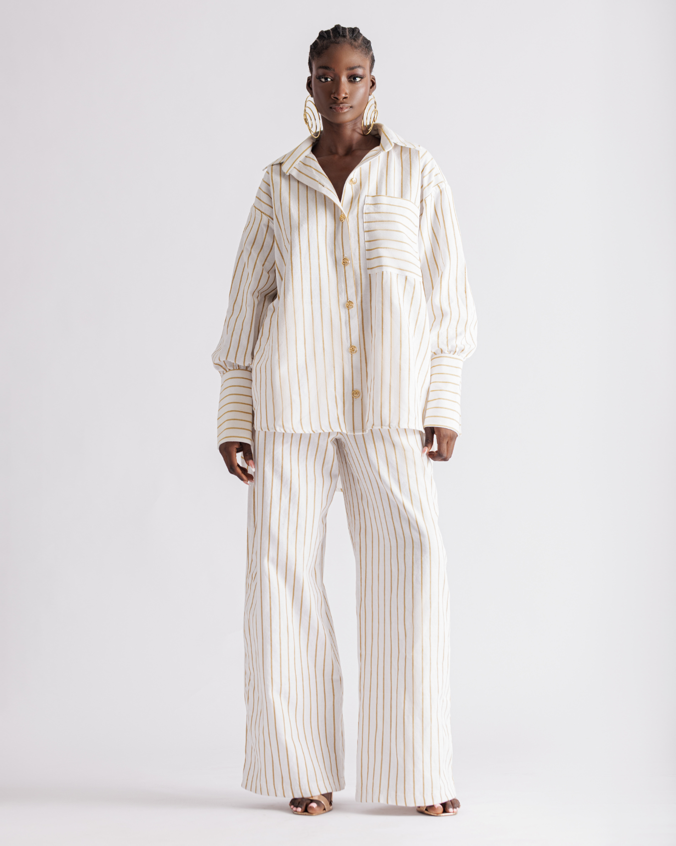 The Minata Striped Pants made from handwoven cotton with a wide-leg silhouette and a light, breathable feel. Featuring pockets and are finished with Kilentar’s signature gold spiral buttons. Style with the coordinating Minata Shirt for a full set, or pair back with wardrobe staples for versatile elegance.